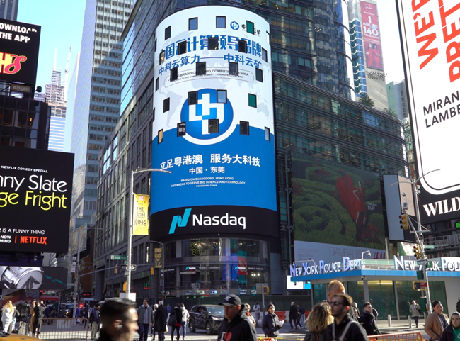 日前,在美国纽约时代广场Nasdaq巨型显示屏上,由广东中科云算力科技有限公司登陆纽约时代广场。