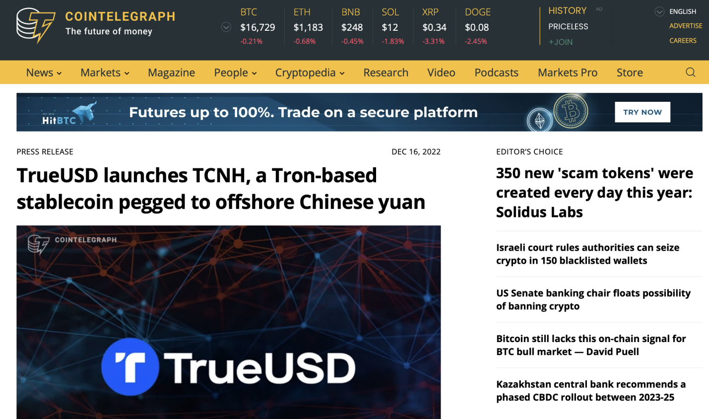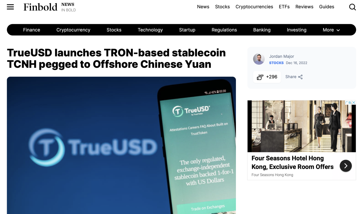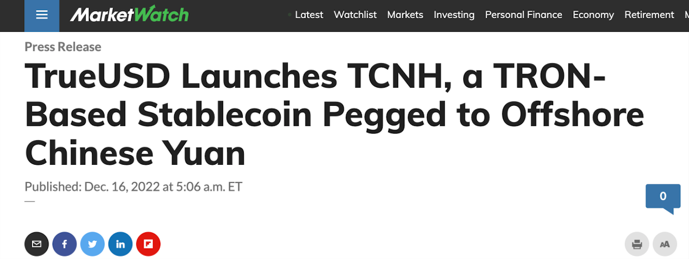Benzinga:离岸人民币稳定币TCNH上线波场TRON
