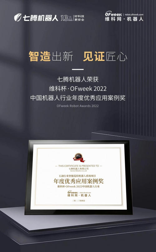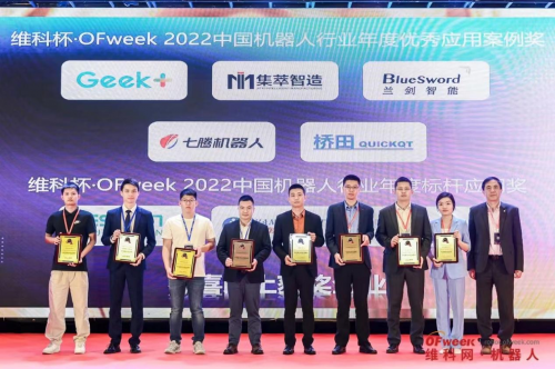在同期举行的“维科杯·2022中国机器人行业年度评选颁奖典礼”上,七腾机器人获得“维科杯·OFweek 2022中国机器人行业年度优秀应用案例奖”荣誉。
