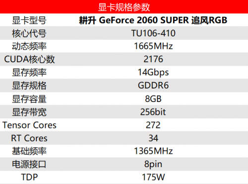 耕升GeForce RTX 2060 SUPER追风RGB 规格参数与公版差异不大,CUDA核心数高达2176,显存规格为256bit-GDRR6 8GB,显存频率可达14000MHz,带宽可达448.0GB/s,负责DLSS 以及RTX功能的深度学习单元、光追单元Tensor Cores为272,RT Cores为34。外接供电为8pin,推荐搭配550W电源使用。